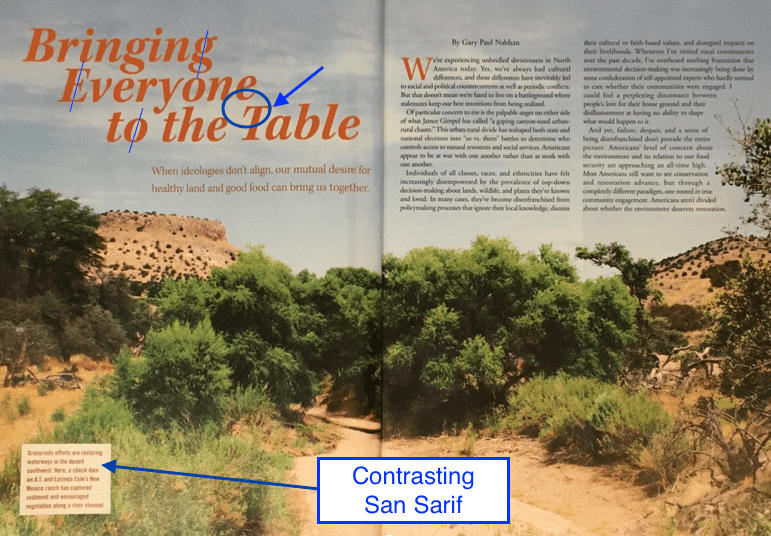 The curvy leading line draws the reader’s eye down the page to drive home the meaning of the article about our country and ideologies being divided. The photographer also utilized the principle of framing with the hills sloping down to the dried riverbed. The depth of field is represented as the images up close give perspective to the distant hills.